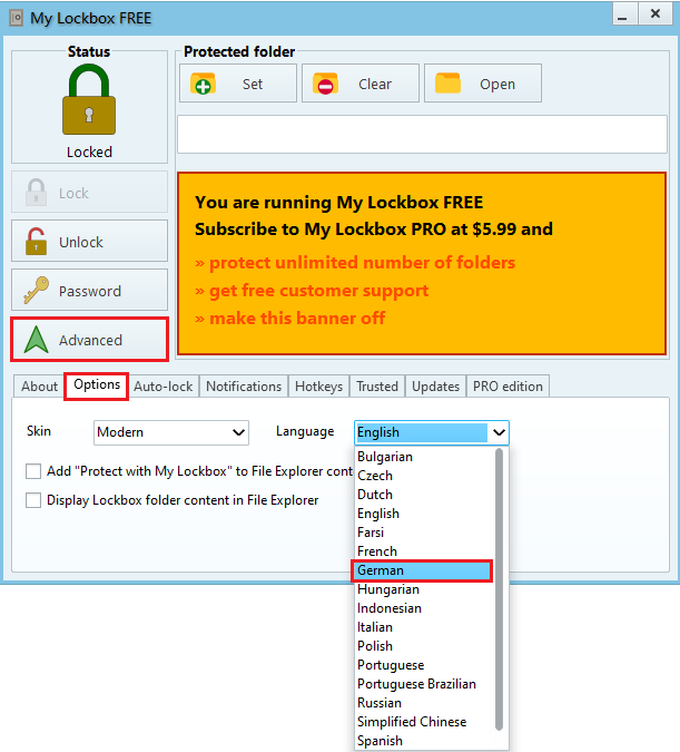 - Dann wird das Hauptfenster geöffnet. Tippen Sie auf Advanced, dann auf Options, wählen German aus, um Deutsch als Oberfläche-Sprache anzuzeigen.
