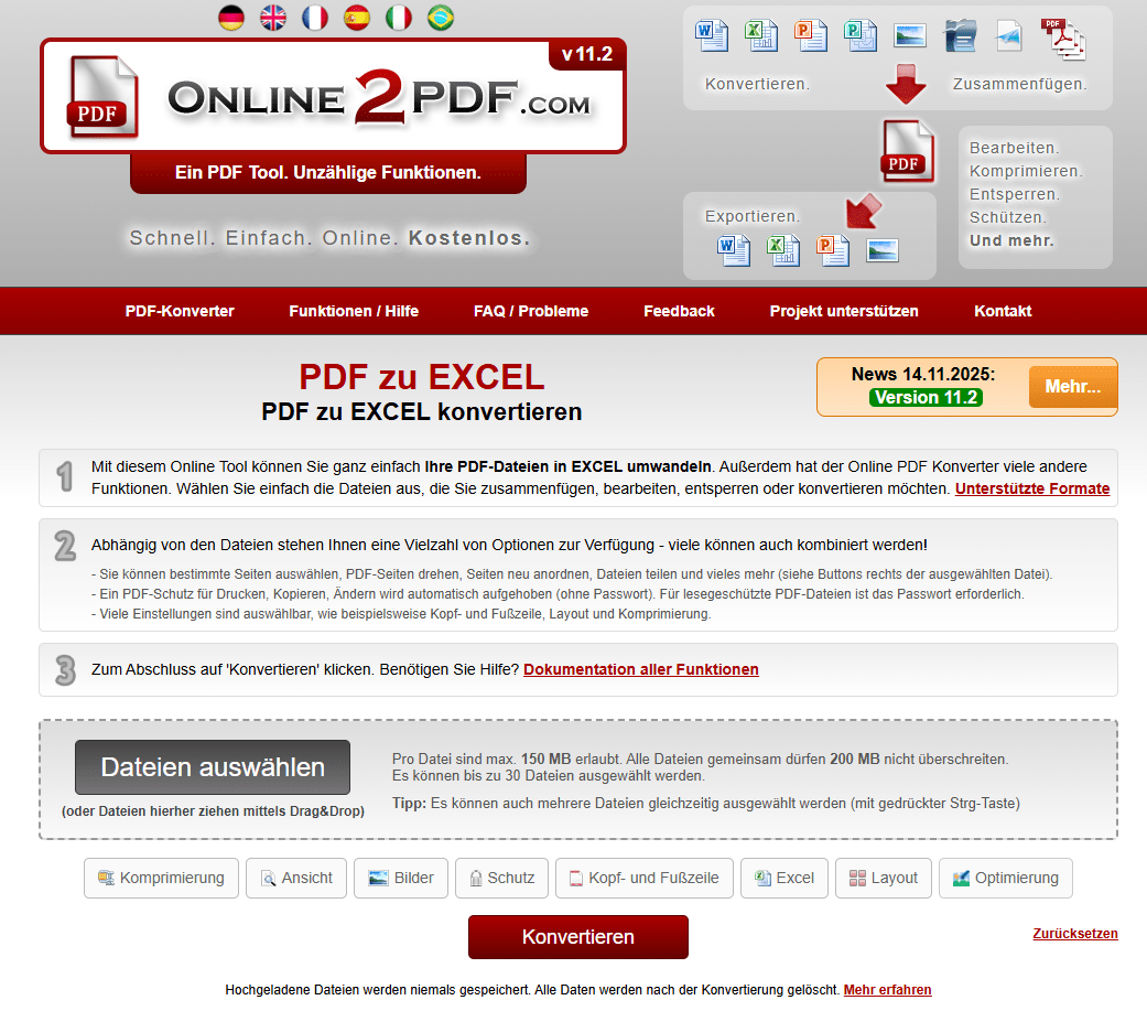 online2pdf.com ermöglicht es Ihnen, mehrere PDF-Dateien bis zu 200 MB von Ihrem Computer hochzuladen. Nach dem Hochladen können Sie sowohl native als auch gescannte PDF-Dateien kostenlos in Word, Excel, PowerPoint, RTF und TXT auf dem Mac konvertieren. Eine weitere beeindruckende Funktion von online2pdf ist die Möglichkeit, die Excel-Ausgaben individuell anzupassen.