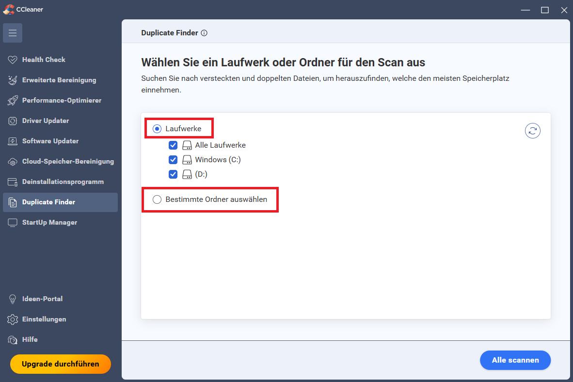 Mit CCleaner können Sie auf intelligente Weise doppelte Dateien suchen oder finden. Sie haben die Möglichkeit, nach doppelten Dateien entweder auf allen Laufwerken oder nur in bestimmten Ordnern zu suchen.