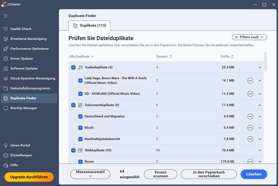 Doppelte Dateien zu finden und zu löschen ist ein effektiver Weg, um den Computer zu säubern, und aus diesem Grund hat CCleaner diese nützliche Funktion eingebaut. Mit dieser Funktion können Sie doppelte Dokumente, Videos, Filme, Fotos oder andere Dateien auf Ihrem Computer entfernen.