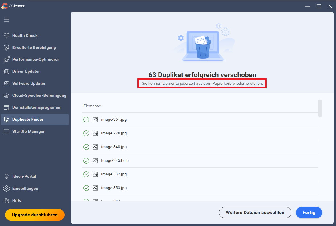 Der Scan führt biltzschnell aus. CCleaner findet jedoch nicht alle Duplikate, sodass einige Dateien in den Duplikat-Ergebnissen fehlen, beispielsweise leicht zugeschnitte, bearbeitete Bild-Verisonen.