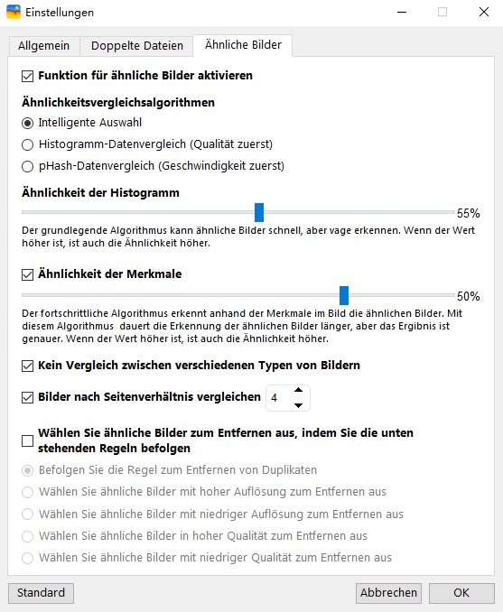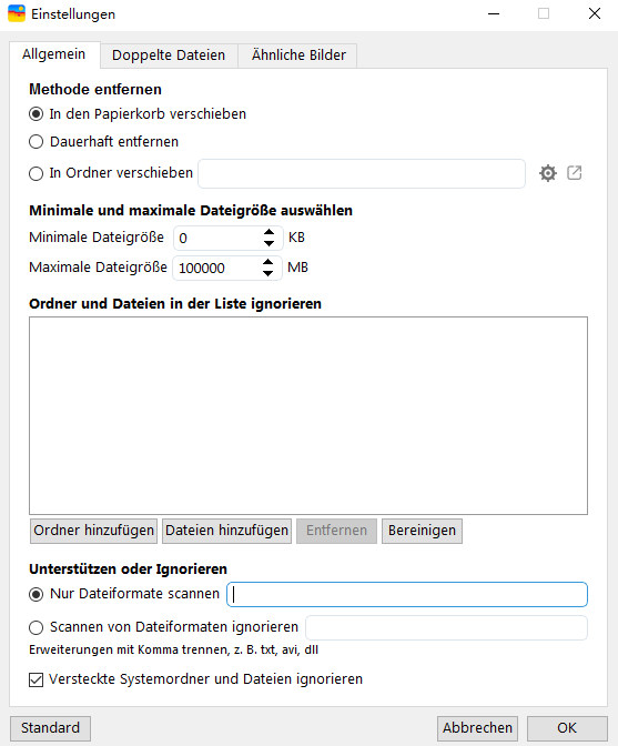 3. Um den Scanvorgang anzupassen, klicken Sie auf das Zahnrad-Symbol in der oberen rechten Ecke. Unter der Schaltfläche Allgemein können Sie eine Löschmethode festlegen sowie Ordner und Dateien vom Scan ausschließen. Unter der Schaltfläche Ähnliche Bilder wählen Sie den Algorithmus und den Ähnlichkeitswert aus.