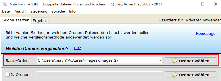 3. Klicken Sie auf den Knopf „Ordner wählen“, dann wählen in dem Auswahl-Dialog ein Verzeichnis auf Ihrer Festplatte aus. Das gewählte Verzeichnis wird dann im Feld „Basis-Ordner“ angezeigt. (im Ordner und dessen Unterordnern suchen)