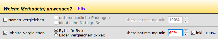 5. Wählen Sie dann „Namen vergleichen“ oder „Inhalte vergleichen“. Die beiden Suche-Methoden lassen sich auch kombinieren. Hier wähle ich „Inhalte vergleichen“, „Byte für Byte“ und lege die minimale Übereinstimmung auf 60% fest.