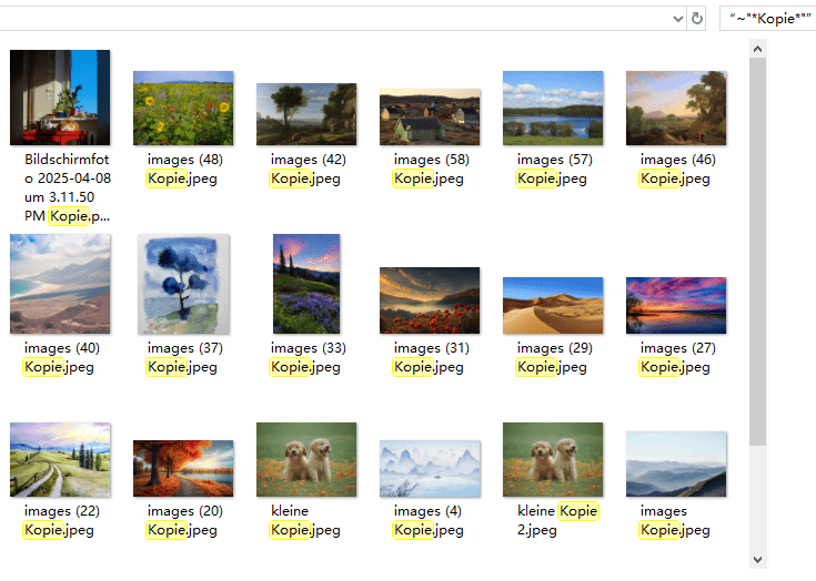 Tipp: In dem Suchfeld von Datei-Explorer geben Sie “~"*Kopie*"” ein, dann werden alle Dateien in dem Ordner angezeigt, deren Dateinamen das Wort „copy“ enthalten. Auf diese Weise können Sie nach doppelten Fotos schnell suchen, die durch Kopieren und Einfügen von Fotos erstellt wurden. Stellen Sie jedoch vor dem Löschen sicher, dass die Originalfotos noch vorhanden sind.