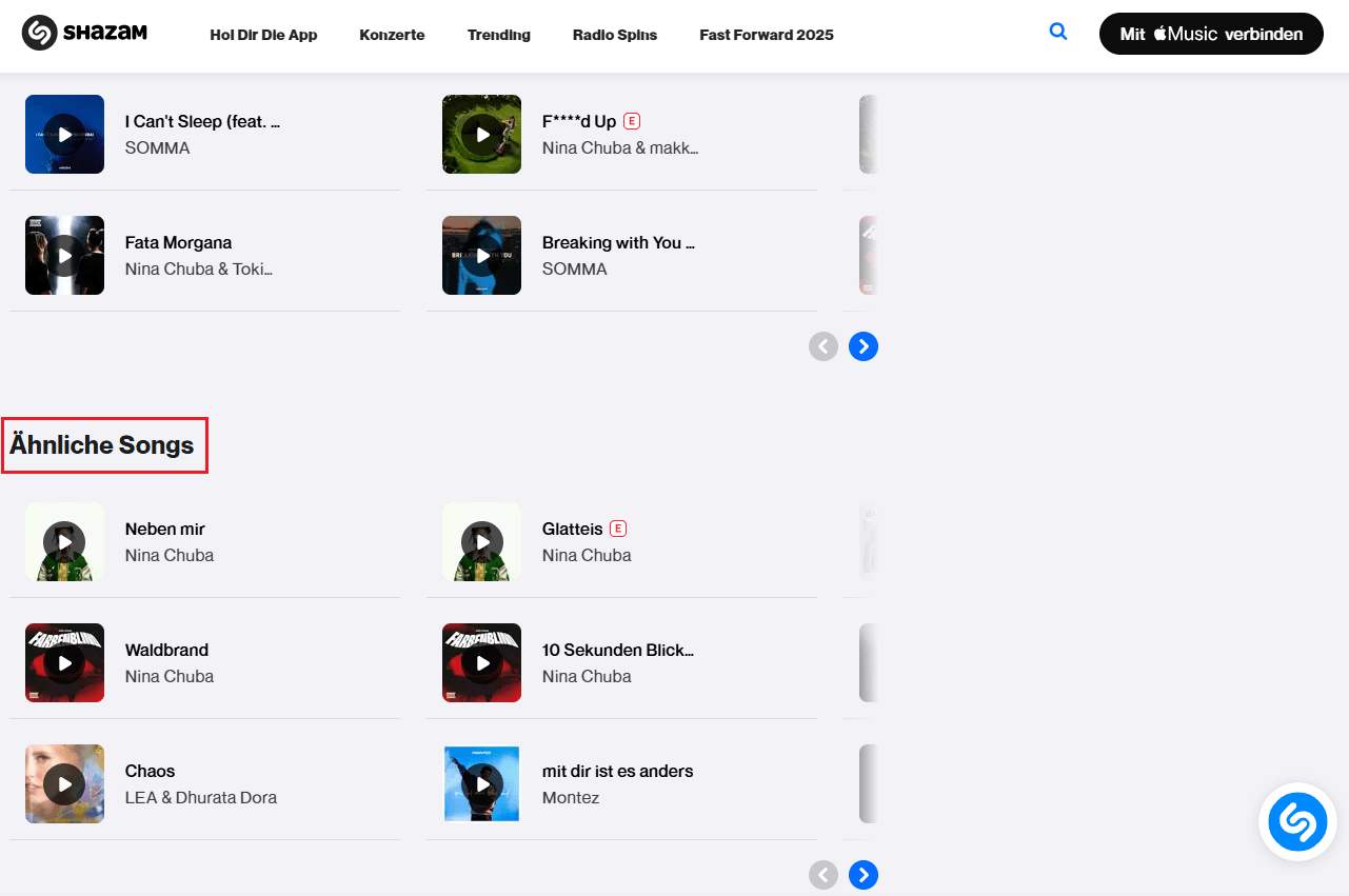 1. Rufen Sie https://www.shazam.com/de-de auf. Geben Sie einen Titel in das Suchfeld ein, das sich in der oberen rechten Ecke der Seite befindet.