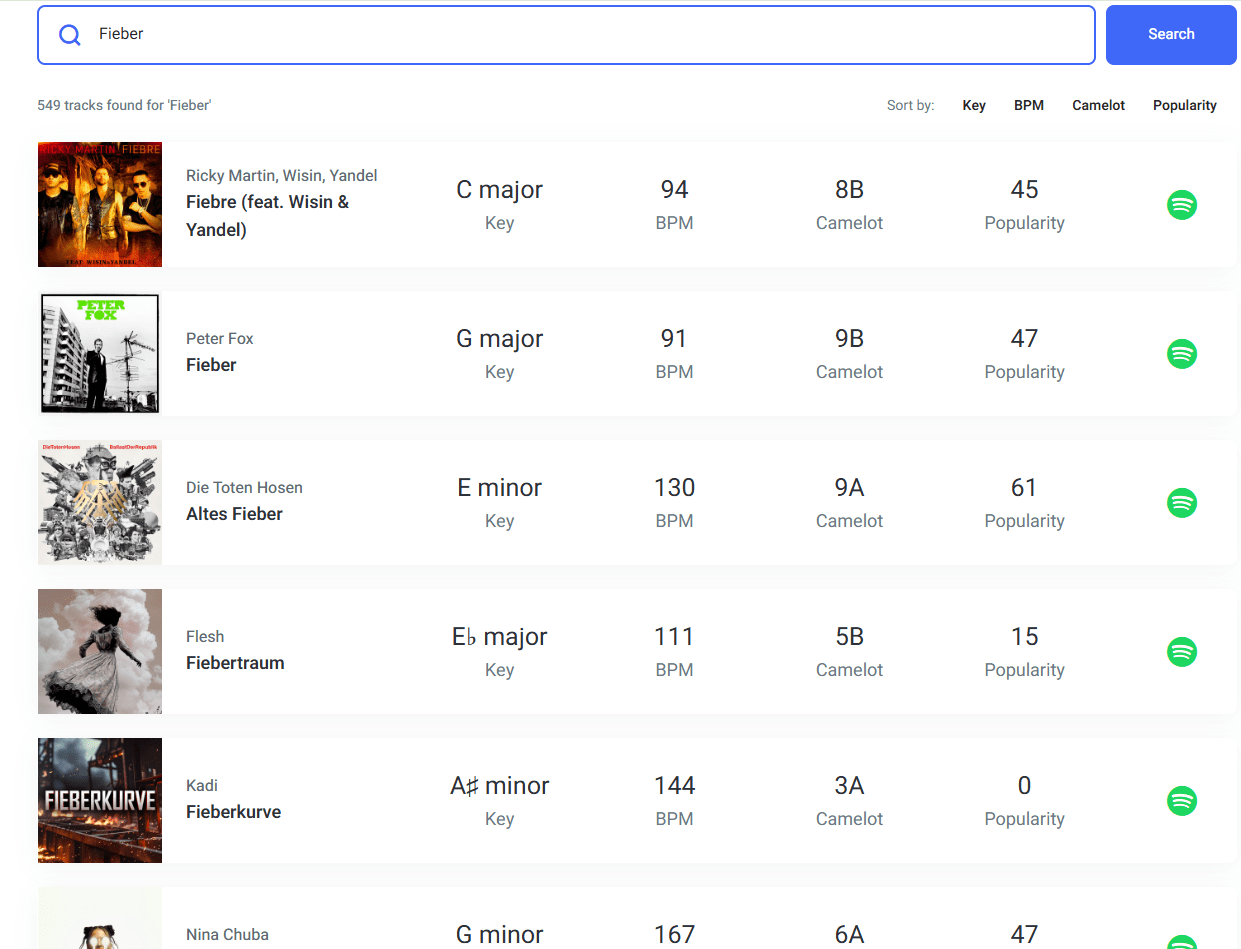Diese Seite ist ein Ort, wo DJs, Musikproduzent, Musikliebhaber die Lieb-Information wie Tonart und BPM finden. Es lässt sich ähnliche Lieder finden.
