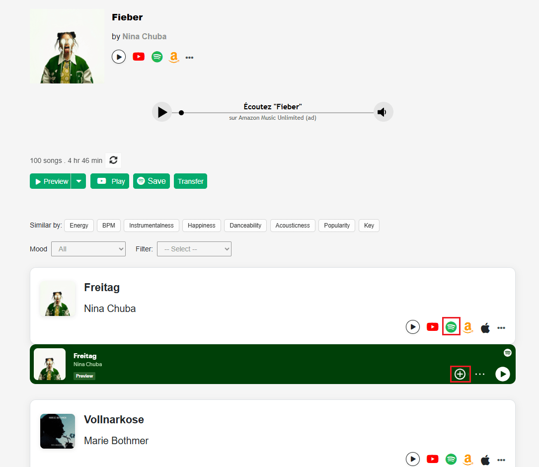 Chosic wird eine List von Lieder innerhalb einiger Sekunden erstellen. Die Funktion "Auf Spotify speichern" erlaubt Sie, eine Spotify-Playlist außerhalb dieser Lieder mit einfach einem Klick zu schaffen. Zugleich können Sie sie durch YouTube leicht abspielen.