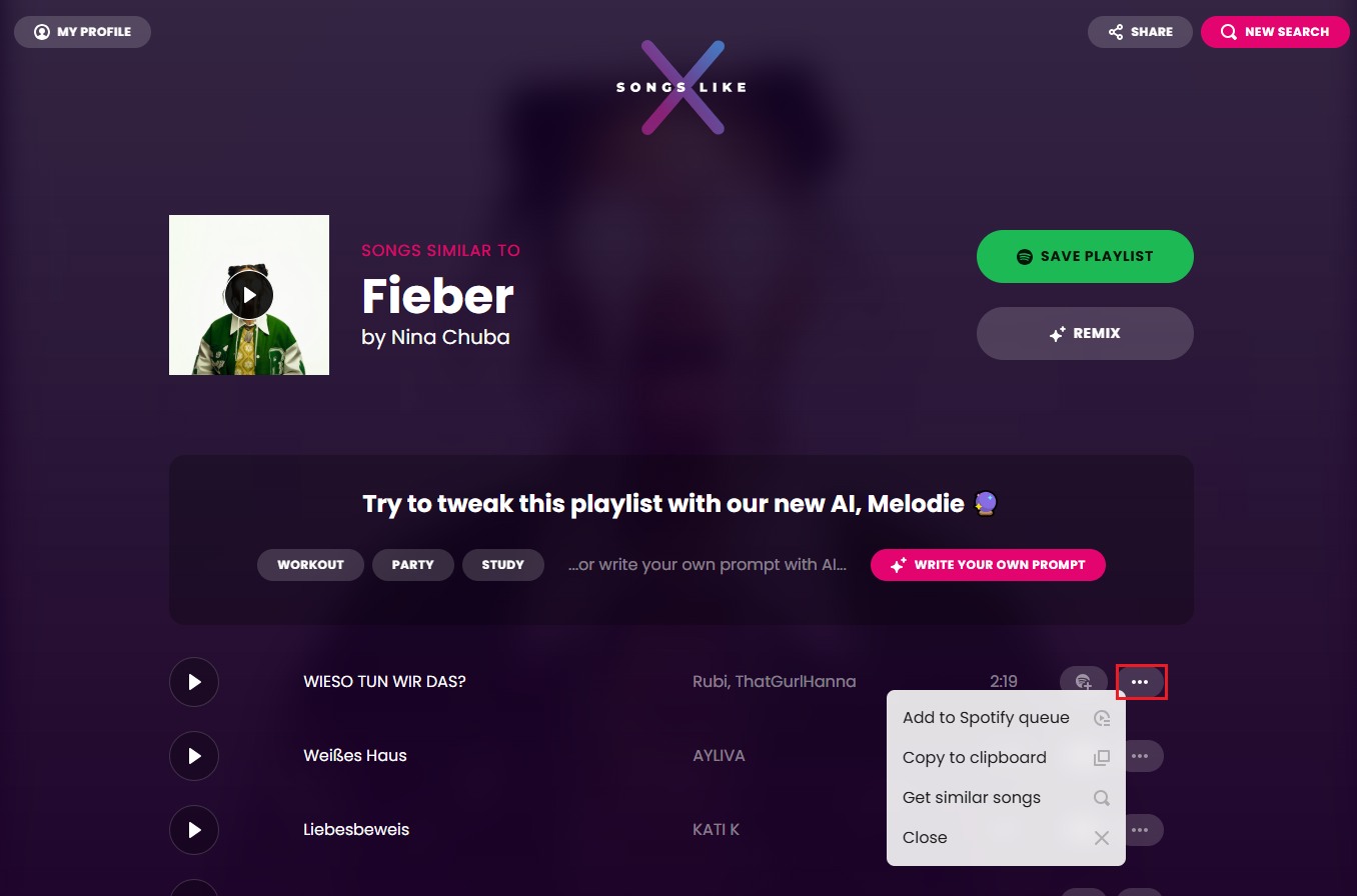 Die Liste der ähnlichen Lieder wird zufällig erstellt. Sie erhalten wahrscheinlich unterschiedliche Listen ähnlicher Lieder, selbst wenn Sie das gleiche Lied auswählen. Die Funktion "Auf Spotify speichern" auf der Website unterstützt, Ihre Lieblingsliste als eine Spotify-Playlist zu speichern.