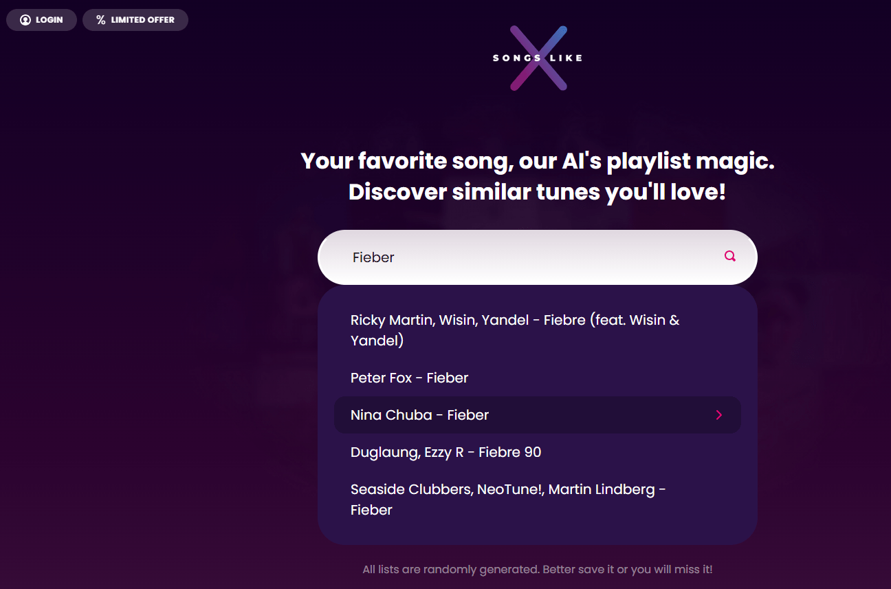 songslikex.com ist eine andere benutzerfreundliche Website, ähnliche Tracks zu finden. Der vollständige Prozess braucht nur zwei supereinfache Schritte. Geben Sie den Name des Lieds ein, wird eine Liste von Lieder, die den gleichen Name haben, angezeigt. Wählen Sie aus der Liste das richtige Lied aus, dann erhalten Sie eine Liste von 50 ähnliche Lieder.