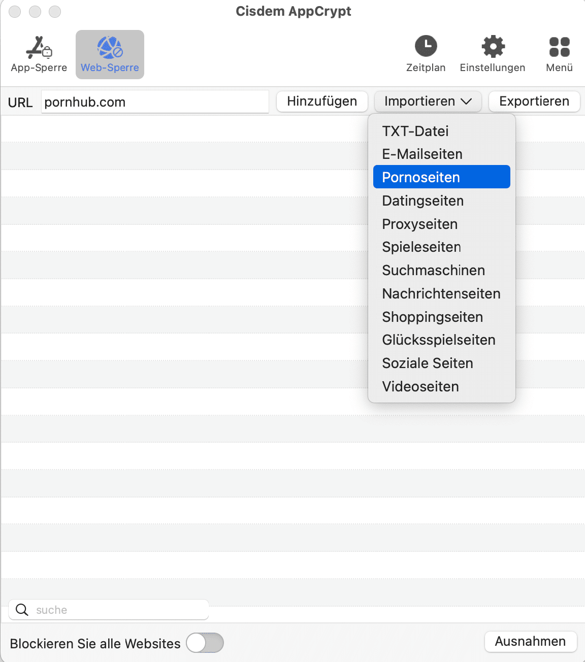 - Geben Sie URLs der Pornoseiten wie pornhub.com ein, klicken Sie auf die Schaltfläche Hinzufügen. Sie können auch auf Importieren > Pornoseiten klicken, um voreingestellte nicht jugendfreie Websites mit einem Klick hinzuzufügen.