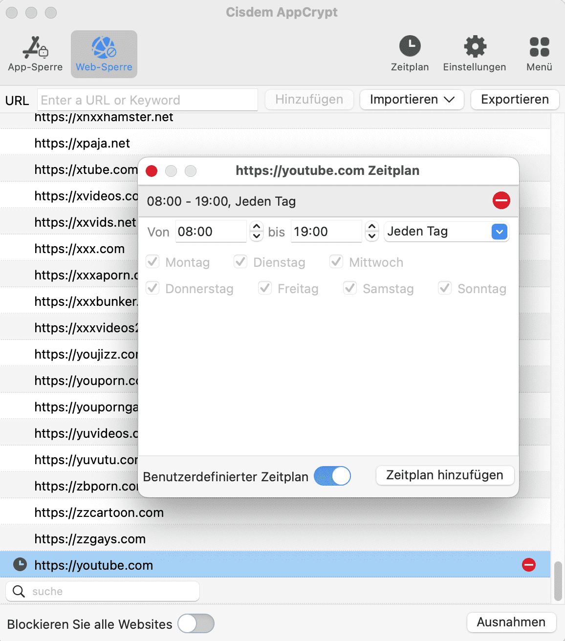 - Wenn Sie soziale Websites wie YouTube oder Instagram für einen bestimmten Zeitraum sperren möchten, klicken Sie auf die Website-URL, dann auf das Uhr-Symbol, aktivieren Benutzerdefinierter Zeitplan, tippen auf Zeitplan hinzufügen. Dann setzen Sie nach Wunsch Zeitplan.