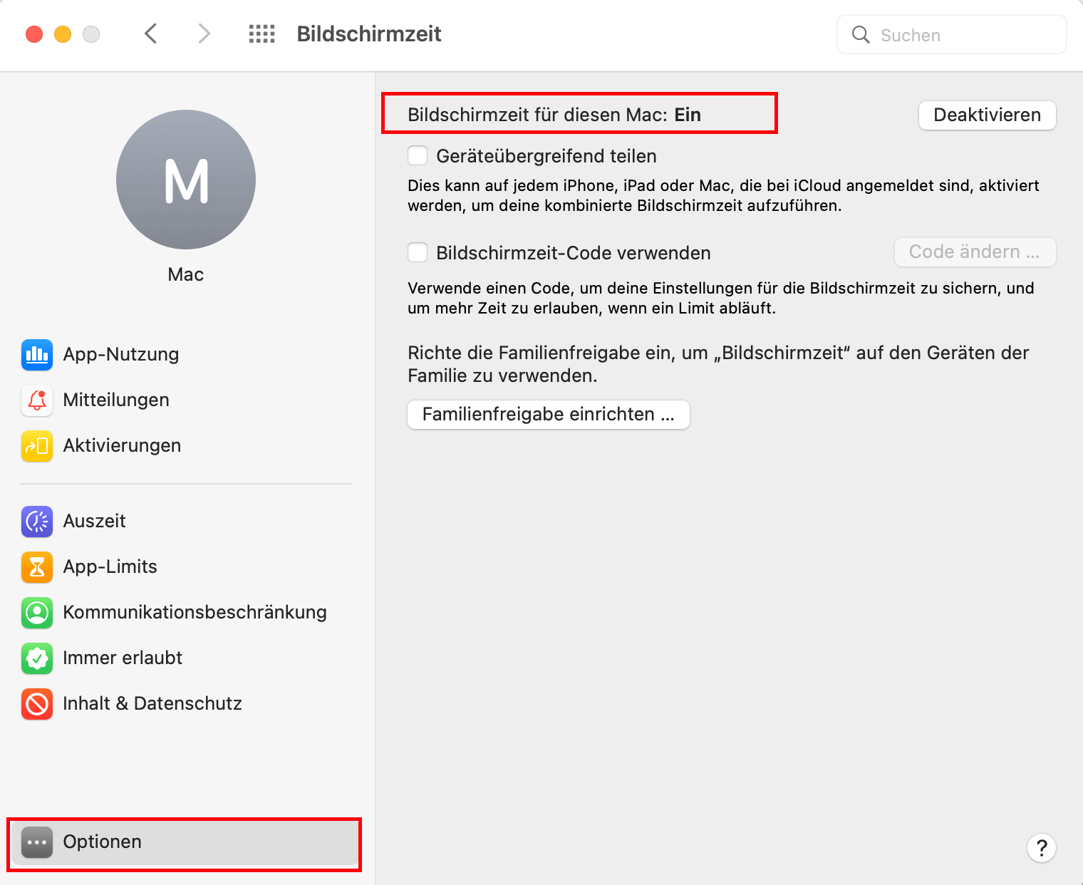 - Klicken Sie auf Optionen in der unteren linken Ecke, um Bildschirmzeit für diesen Mac zu aktivieren, falls es noch nicht aktiviert ist.