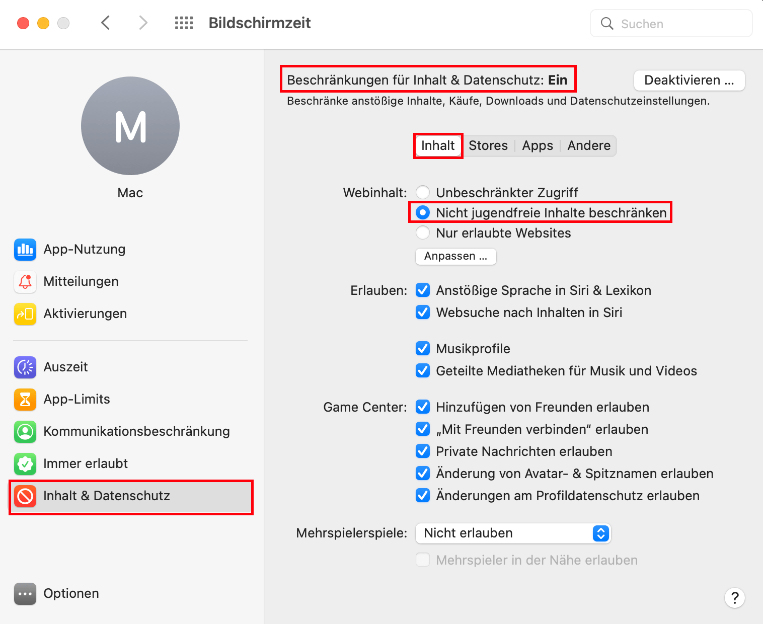 Mit dieser Funktion können Sie ein Benutzerkonto mit Kindersicherung für Ihr Kind einrichten. Dann werden schädlichen Online-Inhalten wirksam eingeschränkt, sodass Ihr Kind auf diesem Mac keine Pornos in Safari ansehen kann.