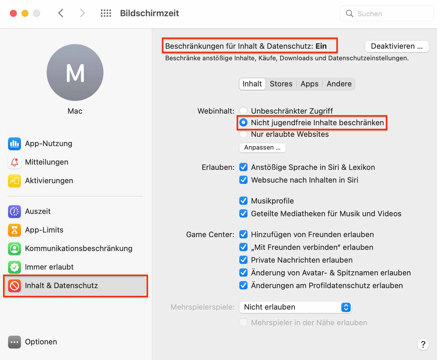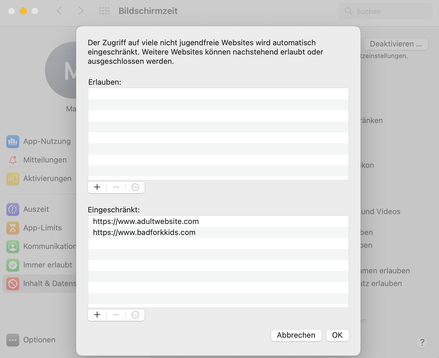 Wenn Sie bestimmte Websites vollständig blockieren und Ihren Mac den Zugriff auf einige Websites für Erwachsene automatisch einschränken lassen möchten, verwenden Sie diese Funktion.