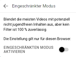 Mit „Eingeschränkter Modus“ können Sie potenziell jugendgefährdende Kanäle und Videos aus den Ergebnissen herausfiltern. Sobald er aktiviert ist, funktioniert er automatisch.