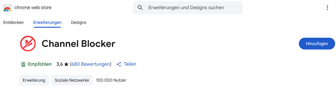1. Laden Sie Channel Blocker aus dem Chrome Web Store oder dem Firefox Add-ons Store herunter und installieren Sie ihn.