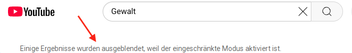 Solange man einen Suchbegriff in dem Suchfeld eingeben, der potenziell nicht jugendfrei ist, wird einige betreffende Ergebnisse ausgeblendet. Zudem werden Kanäle und Videos mit unangemessenen Inhalten, z.B. jugendgefährdende oder gewalttätige Inhalte, von den Suchergebnissen ausgeschlossen.