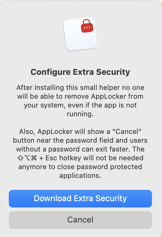 Extra Security Um es zu ermöglichen, schwerer zu umgehen, unterstützt AppLocker, ein zusätzliche Sicherheitsebene hinzuzufügen. Sie können in Apps zur Sperre auswählen Fenster auf Extra Security konfigurieren klicken, und dann laden Extra Security herunter.