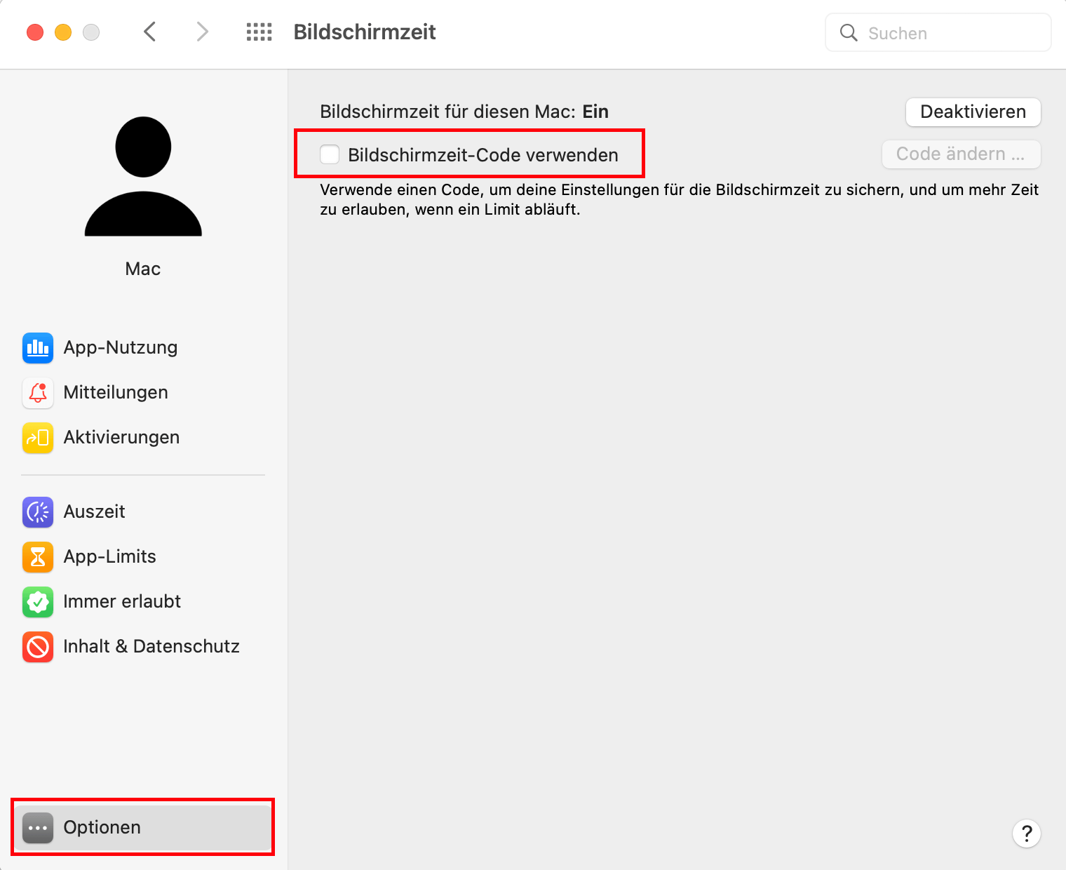 2. In der unteren linken Ecke des Hauptfensters klicken Sie auf Optionen. Aktivieren Sie Bildschirmzeit für dieses Mac.
