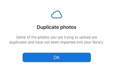 iCloud erkennt beim Hochladen exakt doppelte Fotos, erscheint dabei eine Warnung wie untere. Aber iCloud kann nicht die bereits in dem Konto bestehenden doppelte Fotos identifizieren.![]()