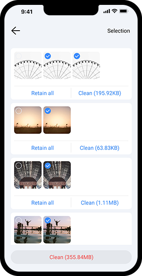 Stick to the automatic duplicate selections or adjust selections, then tap Clean to delete all duplicates of that type. Continue handling other duplicate types.