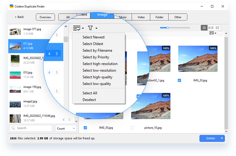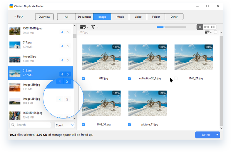In each group of duplicate files, Cisdem Duplicate Finder automatically and intelligently selects the duplicate(s) for deletion, while the original file remains unselected. This enables you to remove all duplicates at once and makes sure that your original files are unaffected and won't be removed! Also, you have the flexibility to adjust the selections by manually selecting or deselecting files.
