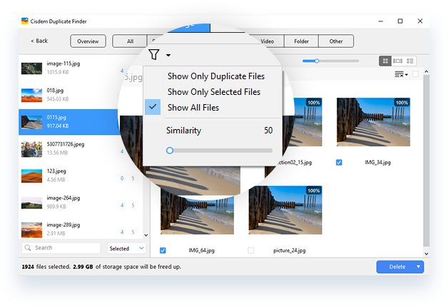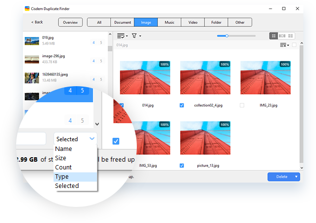 This duplicate file finder displays all scan results under the All tab. You can also view duplicates by file type by going to the corresponding tab (e.g., Image). The app provides three modes to help you effortlessly examine duplicate files.