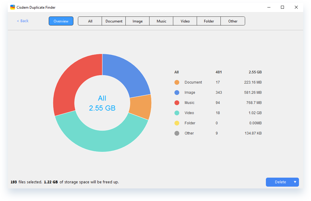 Once Cisdem Duplicate Finder finishes scanning for duplicate files, it provides a pie chart showing the total number of duplicates found and how much storage space they occupy. It also breaks down the results by file type, giving you a clear picture of what duplicates clutter your storage.