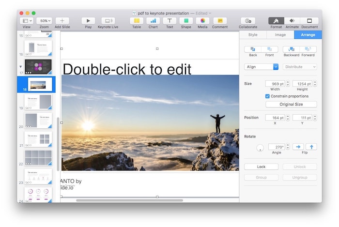 Trascina e rilascia il PDF che desideri convertire in Keynote sul lato sinistro dove tutte le pagine di Keynote sono elencate nelle miniature. Puoi spostarti su e giù mentre trascini il PDF su Keynote. Nel pannello di destra, puoi scegliere lo stile, l'immagine e disporre le icone per modificare le impostazioni del PDF importato.