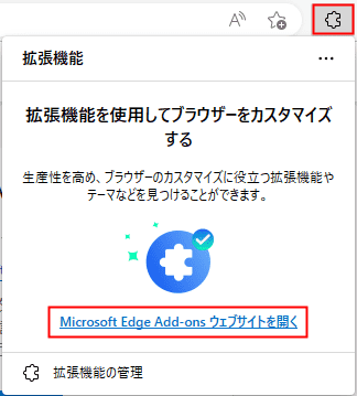 1. Edgeを起動します。アドレスバーの右にある拡張機能アイコンをクリックして、Mircosoft Edge Add-onsウェブサイトを開きます。