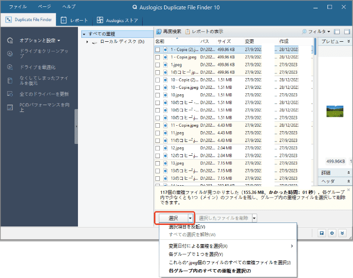 - 重複ファイルの自動選択条件をカスタマイズでき、手動選択もできる