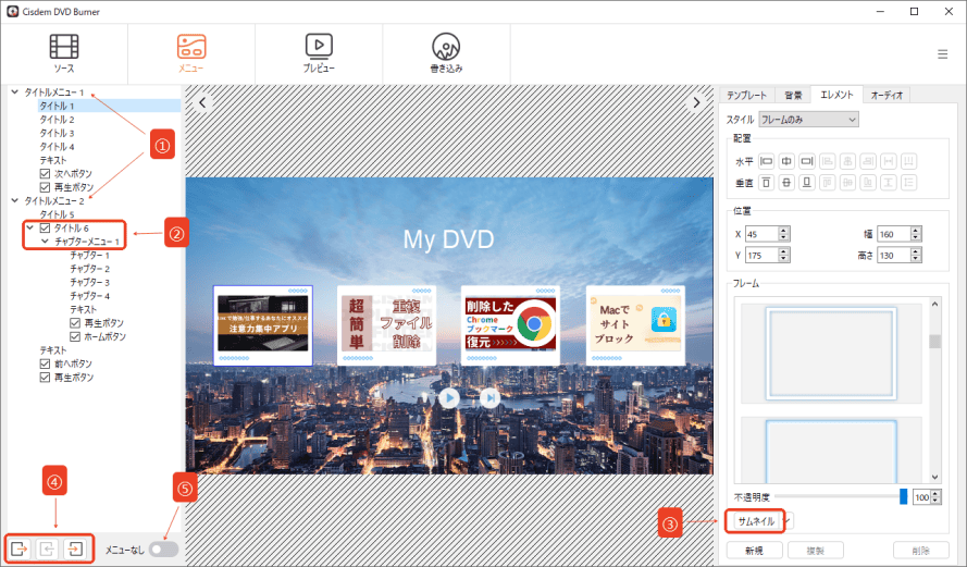 - 各タイトルやチャプターのサムネイルは、③のところで動画のスクリーンショットを撮り変更できます。