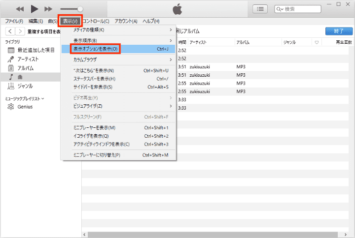 4. ファイル名が同じ/似ている場合、名前順で並び替えれば重複音楽を簡単に見つけ出します。ファイル名が違う場合、サイズ順で並び替えましょう。「サイズ」という列がない場合、「表示」>「表示オプションを表示」をクリックします。