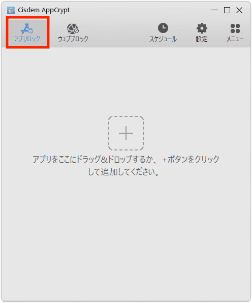 5. パスワードを入力すればAppCryptのメイン画面が表示されます。デフォルトで「アプリロック」画面に入ります。プラスボタンをクリックして、ロックしたいアプリを追加します。