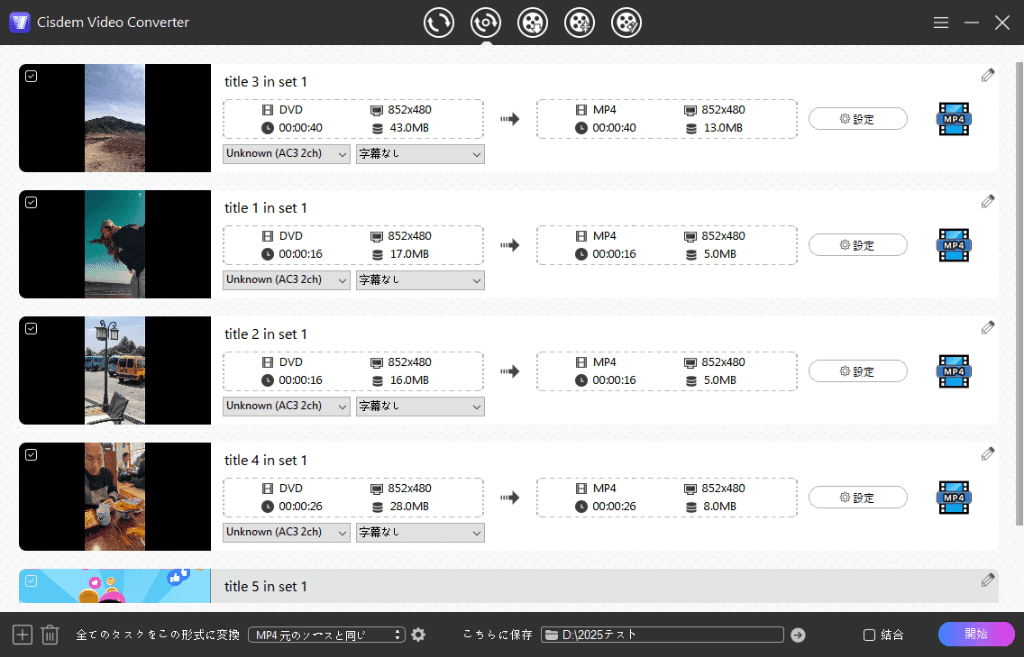 右下隅の「開始」ボタンをクリックしてISOファイルをMP4に変換し始めます。複数のタイトルを一つのMP4ファイルに結合したい場合は、「結合」機能を有効にしましょう。