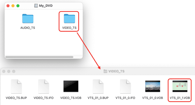 1.FinderでISOファイルを開き、「VIDEO_TS」フォルダを開いてVOBファイルを見つけます。