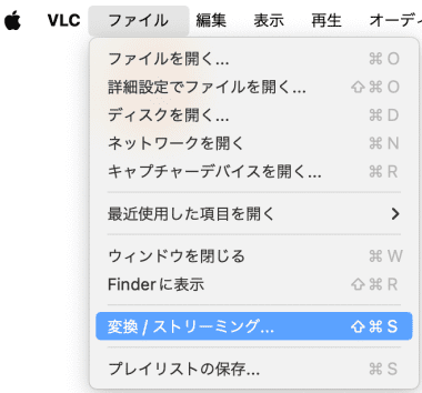 2.VLCを起動して、「ファイル」>「変換/ストリーミング」をクリックします。