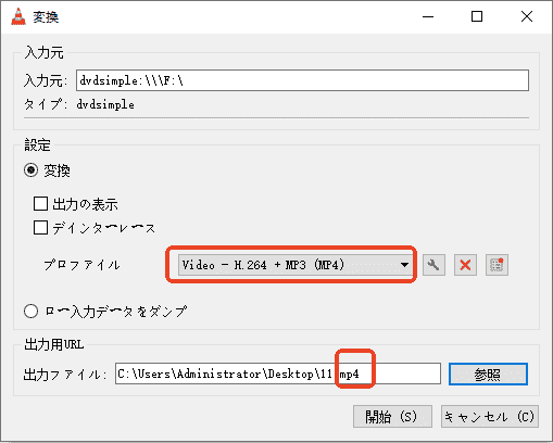 4.ここでは注意しなければいけません:直接「プロファイルの選択」で出力形式を「Video-H.264+MP4(MP4)」と設定する場合、出力するファイルの拡張子は「.m4v」になってしまい、「.mp4」と設定することはできません。