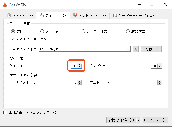 8.上記の手順に沿って、もう一度「ディスク」タブに入ります。「開始位置」の「タイトル」のところを「2」と設定して、「変換/保存」をクリックします。