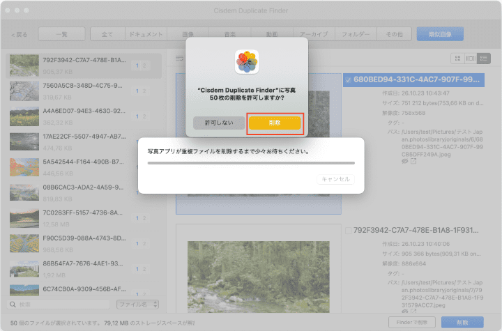 12. そして「削除」ボタンをクリックして、残りの50枚の類似写真を削除します。写真ライブラリの場合はステップ 8で削除手順をご参考ください。