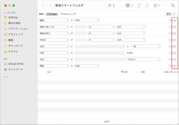 - 右上隅の「保存」の右にある「+」ボタンをクリックし、検索条件を追加します。ここでは「種類」が「すべての」「イメージ」と設定します。特定の形式の写真のみを検索することもできます。