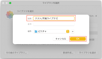 - 新しい写真ライブラリの名前と保存場所を設定し、「OK」をクリックします。
