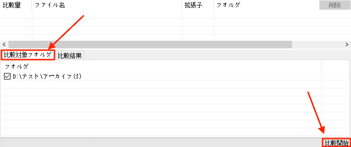 2. 検索したいフォルダを「比較対象フォルダ」にドラッグ&ドロップして、「比較開始」をクリックします。