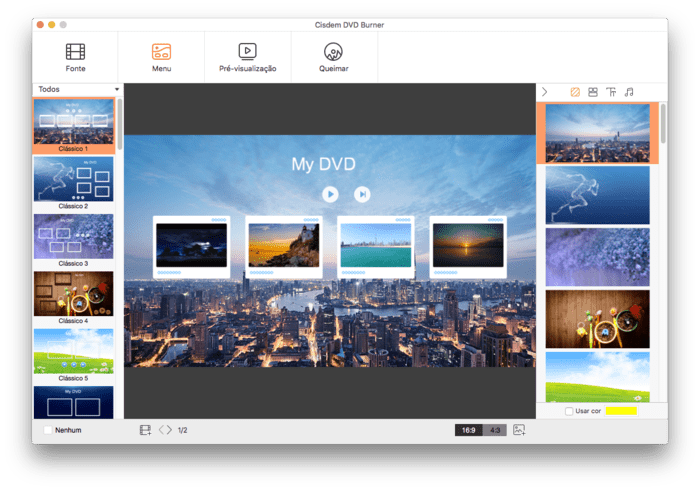 Cisdem DVD Burner fornece vários modelos gratuitos de menu de DVD para diferentes ocasiões e eventos, tais como Clássico, Natal, Ano Novo, Dia dos Namorados, Aniversário, Casamento, Graduação, Esportes, Bebê, Viagens e muito mais. Você pode selecionar facilmente um para se adequar ao tema de seu DVD ou simplesmente ir sem um menu. Além disso, você pode definir a relação de aspecto do vídeo e personalizar o menu do DVD. Há 2 relações de aspecto comuns: 16:9 para tela widescreen e 4:3 para tela cheia. Você pode selecionar o fundo do menu de cor sólida ou imagem importada, exibir botão de título como Moldura, Moldura & Etiqueta ou Etiqueta, mostrar botão de menu como Ícone, Ícone & Etiqueta, Etiqueta ou simplesmente escondê-los, editar o texto do menu e definir sua fonte, tamanho e cor. Para obter mais criatividade, você pode até mesmo adicionar sua música de fundo favorita e aplicar o efeito Fade In/Out.