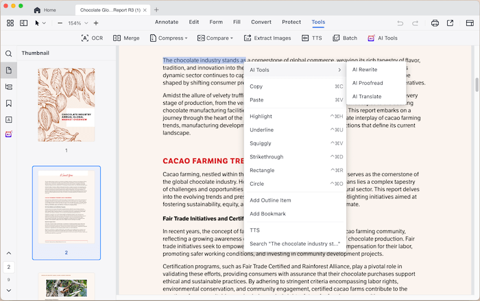 * Right-click on text: Quick rewrite, summarize or translate with AI tools, annotate, add outline, or search the selected word across the document.