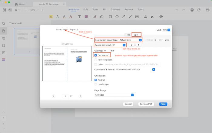 If you need to print an A3 PDF but only have A4 paper, splitting the document across two A4 pages is an easy and effective solution. By splitting the original page across two A4 sheets, you can produce a readable, full-size printout that can be joined together seamlessly. This guide shows you the steps how to print an A3 PDF on two A4 pages using Cisdem PDFMaster.
