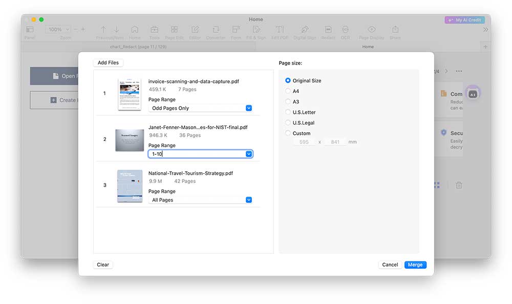 3. Add PDF files that you want to merge. You can change the page range for each imported PDF file. Also, you can select the page size of the output as per your requirements. merge pdf with cisdem 02