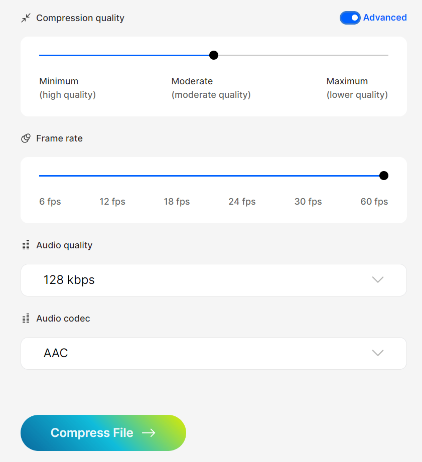 For example, you can change the compression and audio quality. Additionally, enable the “Advanced” button, set the frame rate and audio codec. I kept the default setting, which is to select the “Moderate” quality for compression. - Hit “Compress File”.