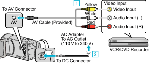 1. Connect your VHS-C or Hi8 camcorder and DVD recorder with an AV cable (yellow for video, white & red for left & right audio). Note: If there is an S-Video cable, replace the yellow video cable in the AV cable.